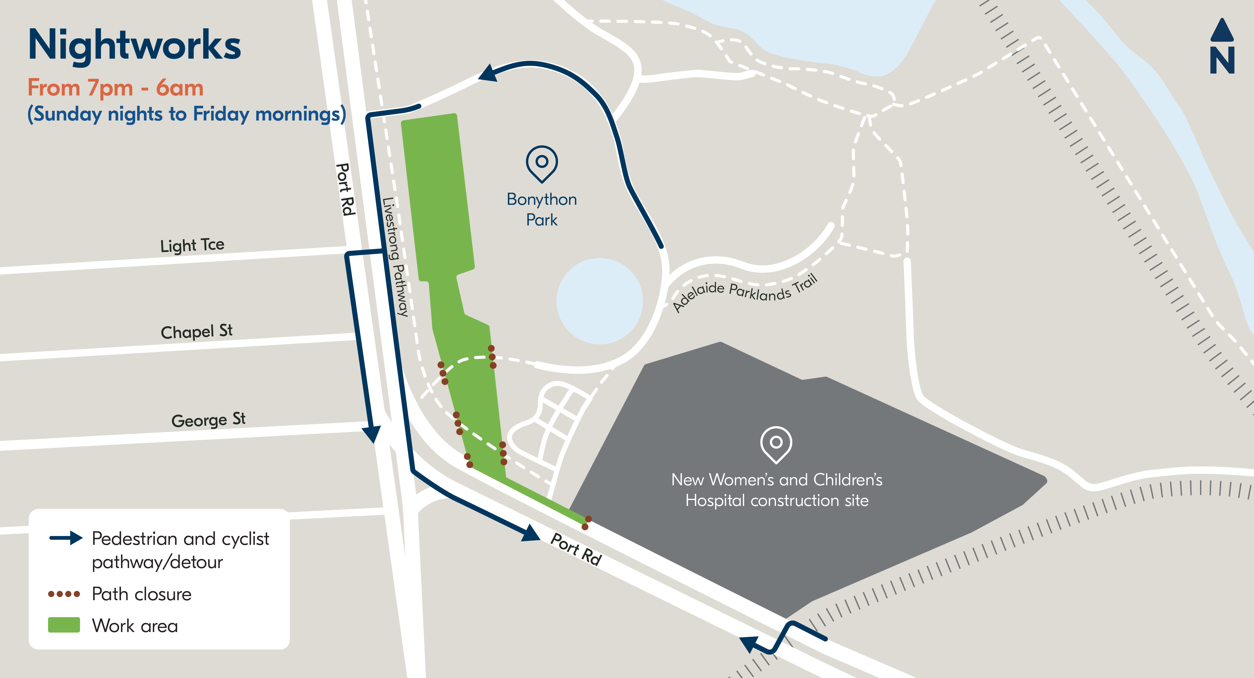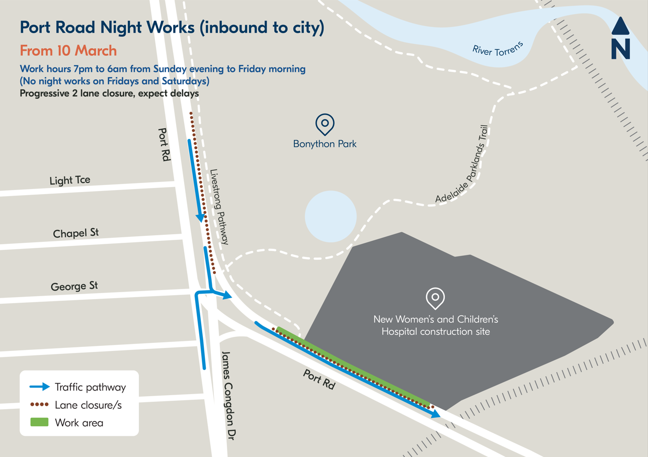 - Port Road between Bonython Park and Royal Adelaide Hospital: up to 2 x city bound traffic lanes will be impacted for nightworks only, reinstated for day traffic. Traffic management including Emergency Services access will be in place.