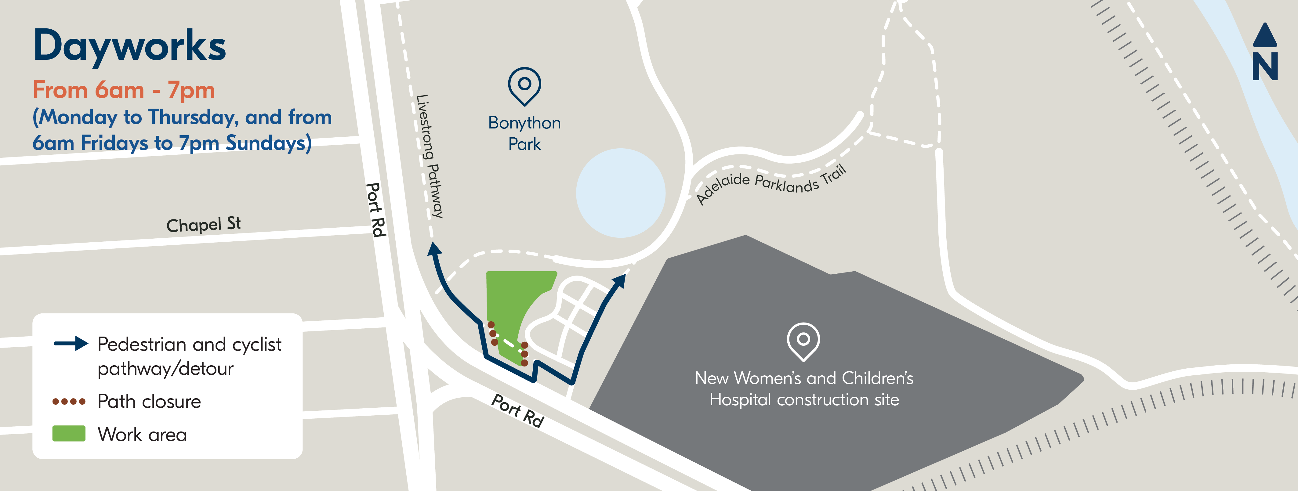 The SUP along Port Road will not be impacted by our works during the day, though detours remain within Bonython Park for the Adelaide Parklands Trail as per map below: