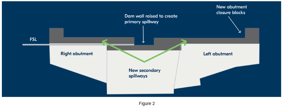 - To achieve the level of flood mitigation outlined above, the dam crest would be raised and a slot created to enable low flows to pass. This enables the full supply level to be maintained and removes the gates (figure 2). Modelling shows the spillway slot would be between 11 and 18 metres wide, and up to three metres deep.