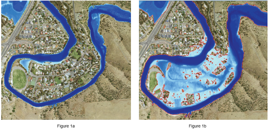 In meeting ANCOLD’s improved standards and guidelines that support the ongoing protection of downstream communities in the event of flood and earthquake, we have modelled that the Onkaparinga River downstream of Mount Bold can pass 170m3/s (metres cubed per second) without flooding properties (figure 1a). Flows above this are expected to have a one in 15-year recurrence, that is significantly reduced by installing flood mitigation on the spillway (figure 1b).
