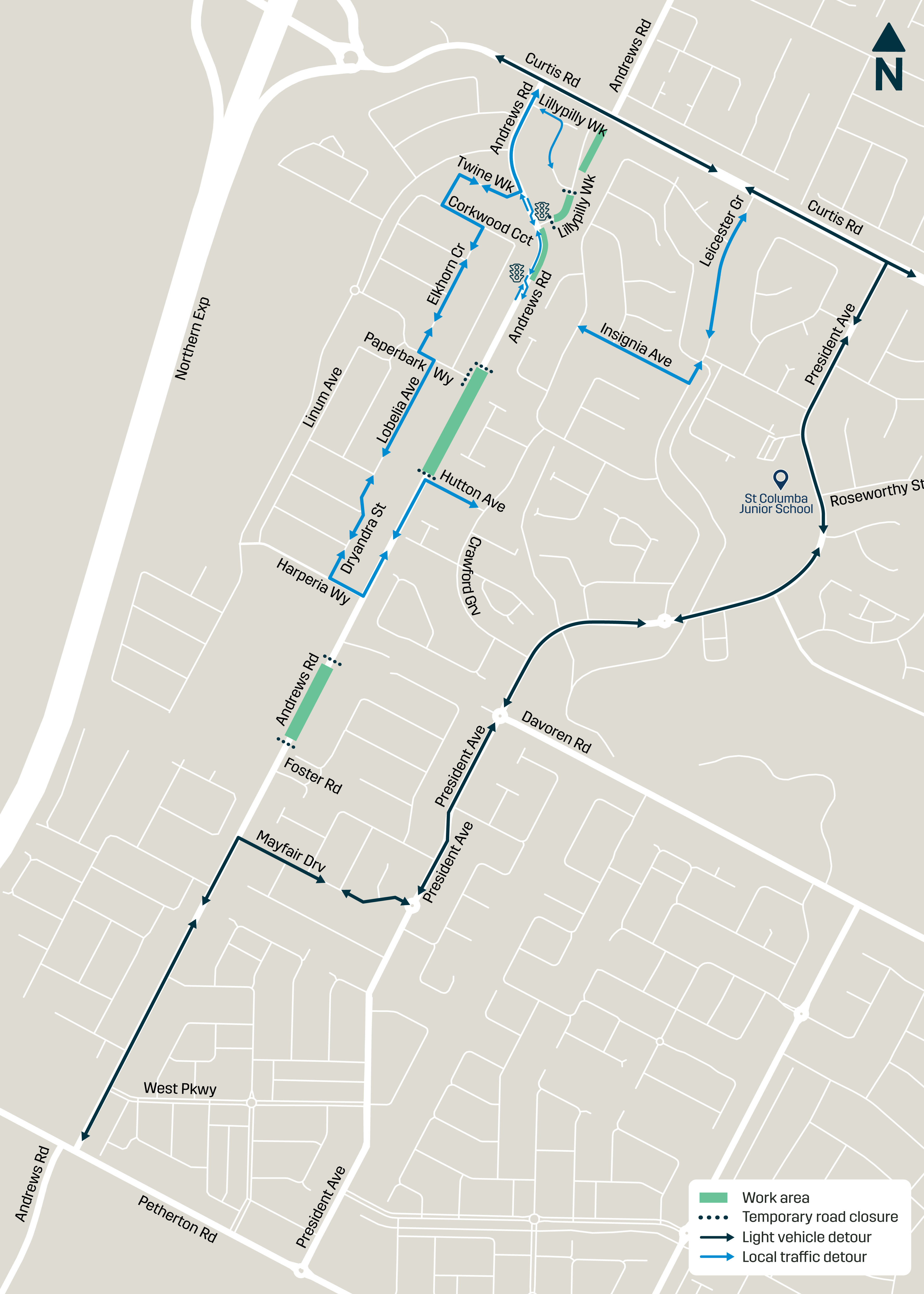 - Closure on Andrews Road between Lillypilly Walk and Hutton Avenue