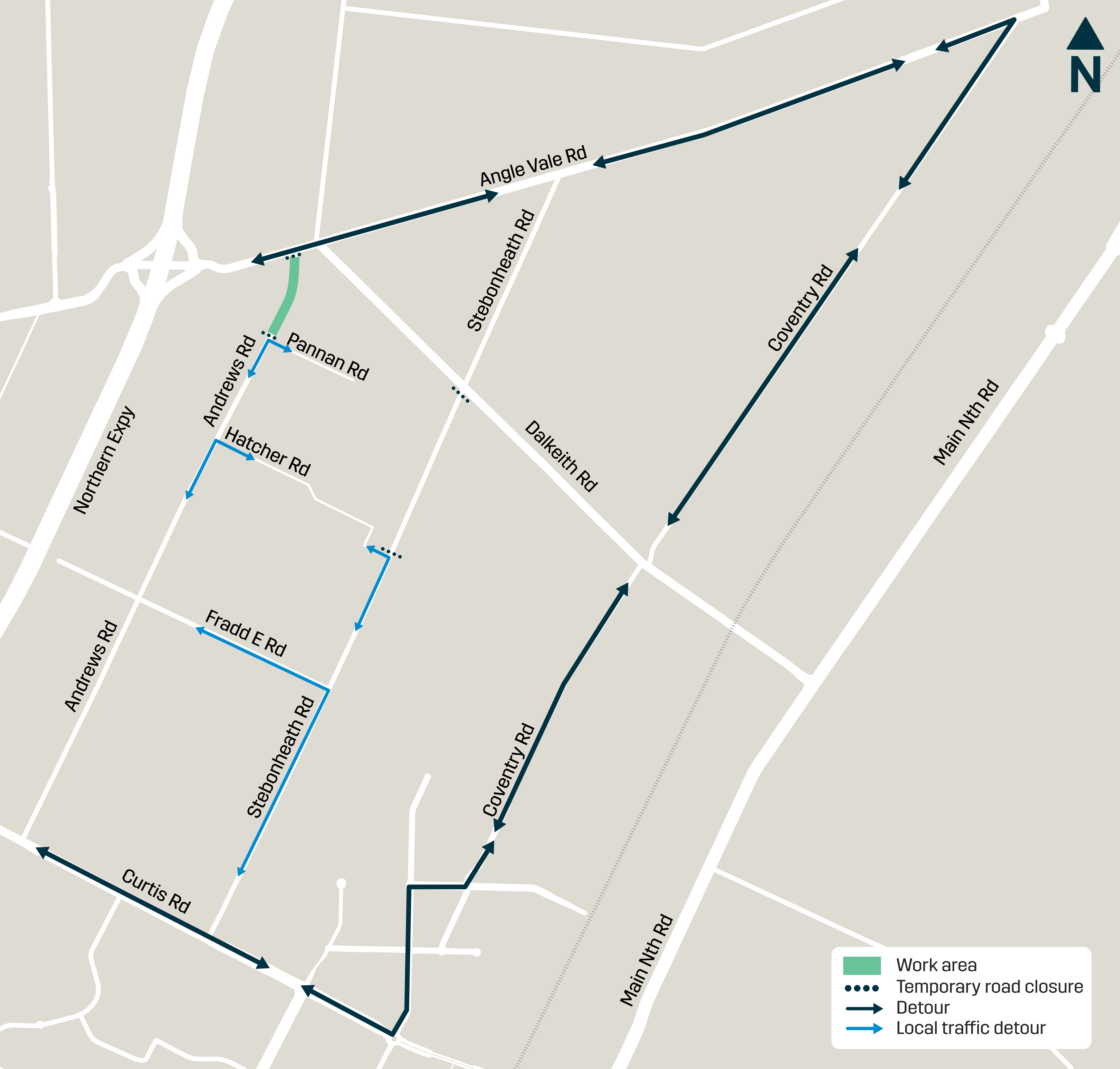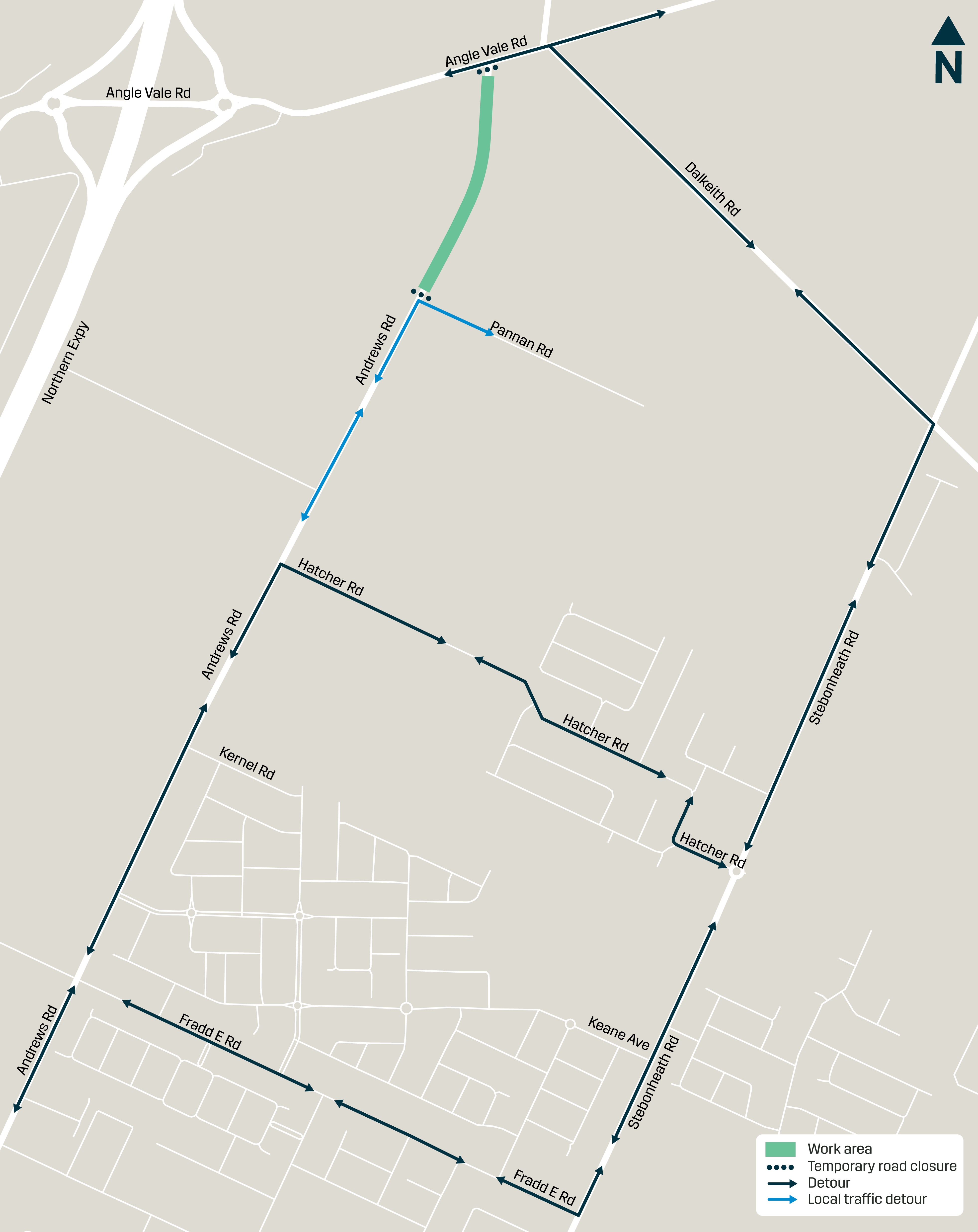 - Andrews Road will be closed between Pannan Road and Angle Vale Road during works