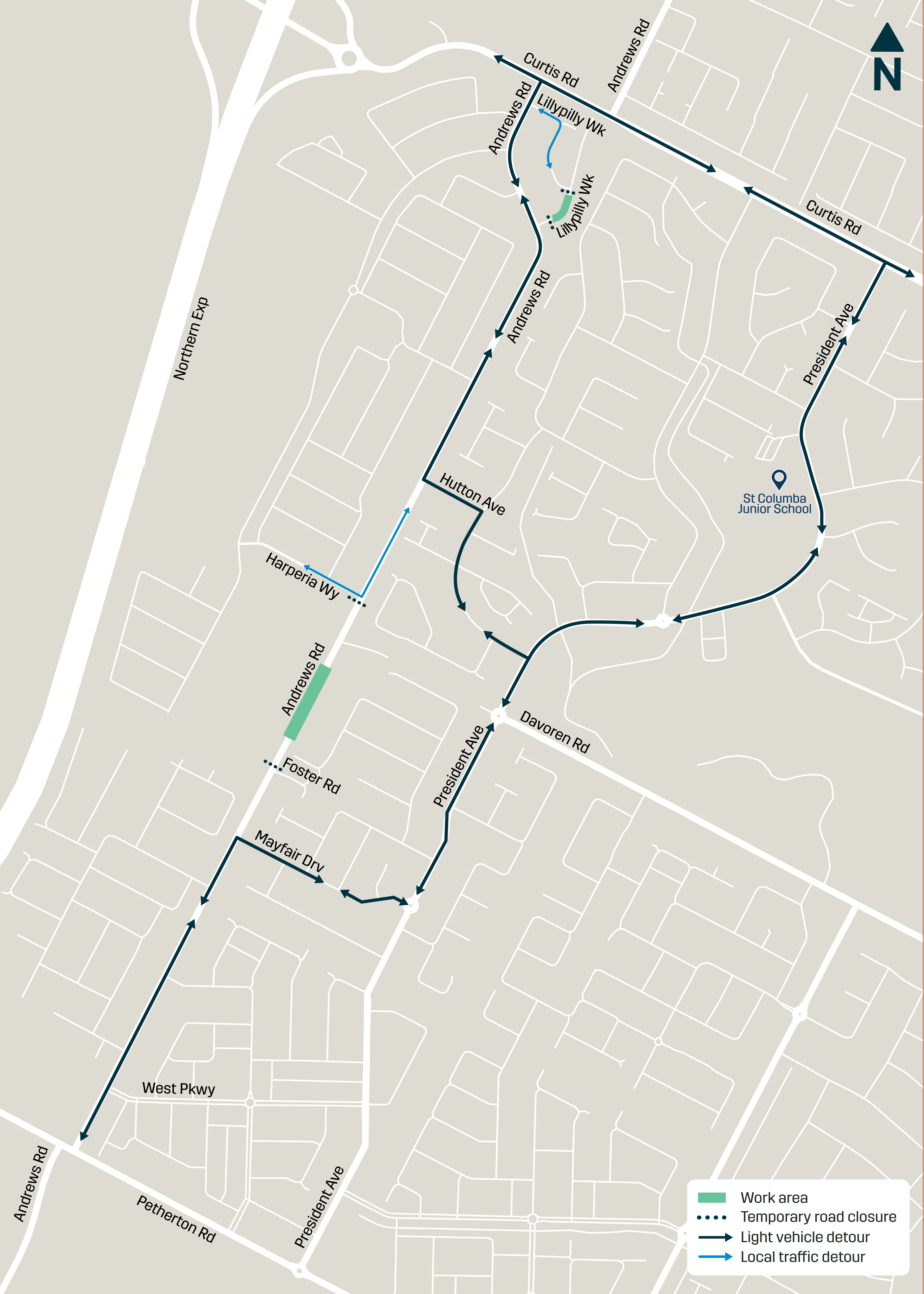 - to safely complete the works, sections of Andrews Road will be closed to traffic at all times