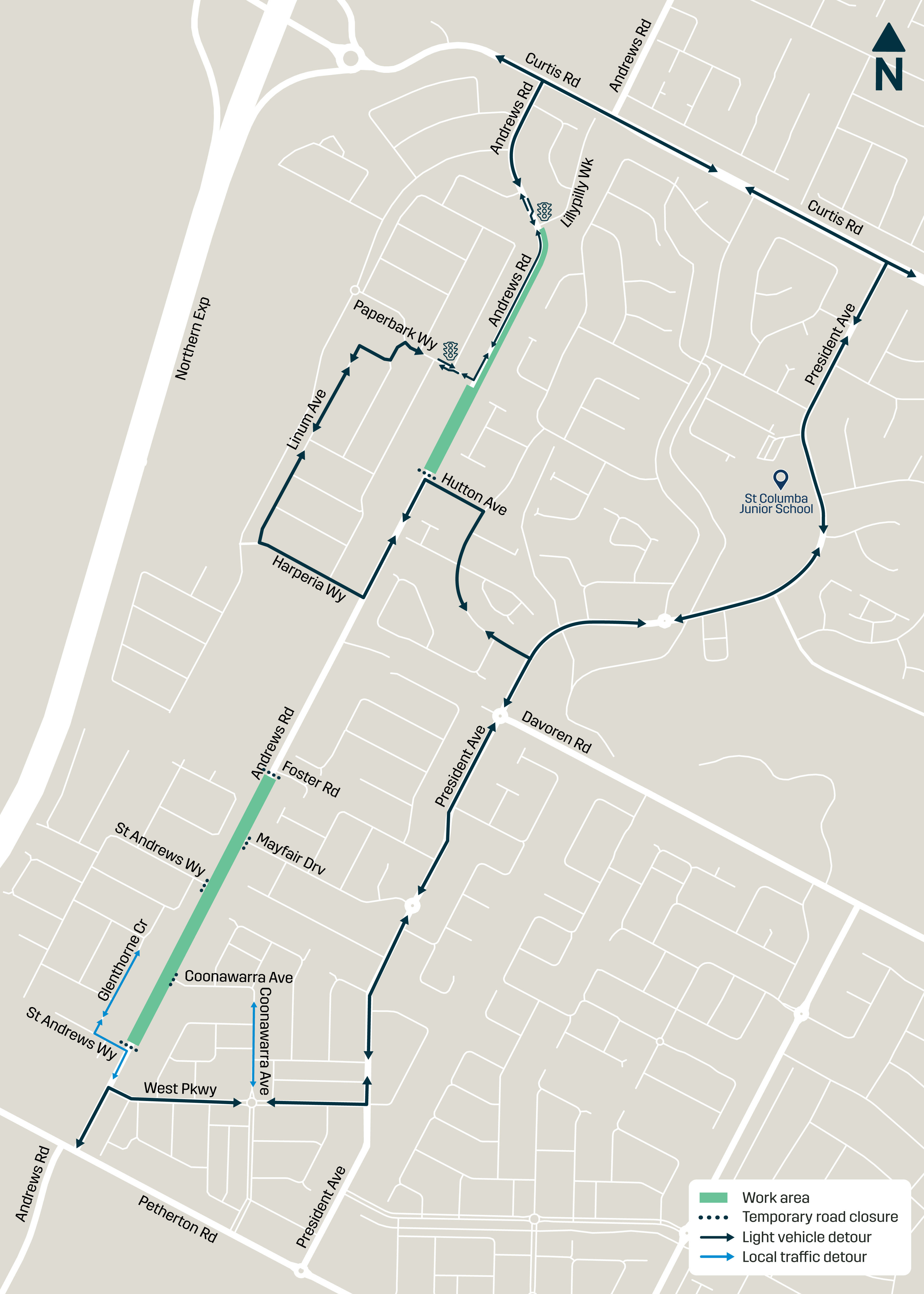 - to safely complete the works, sections of Andrews Road will be closed to traffic at all times
