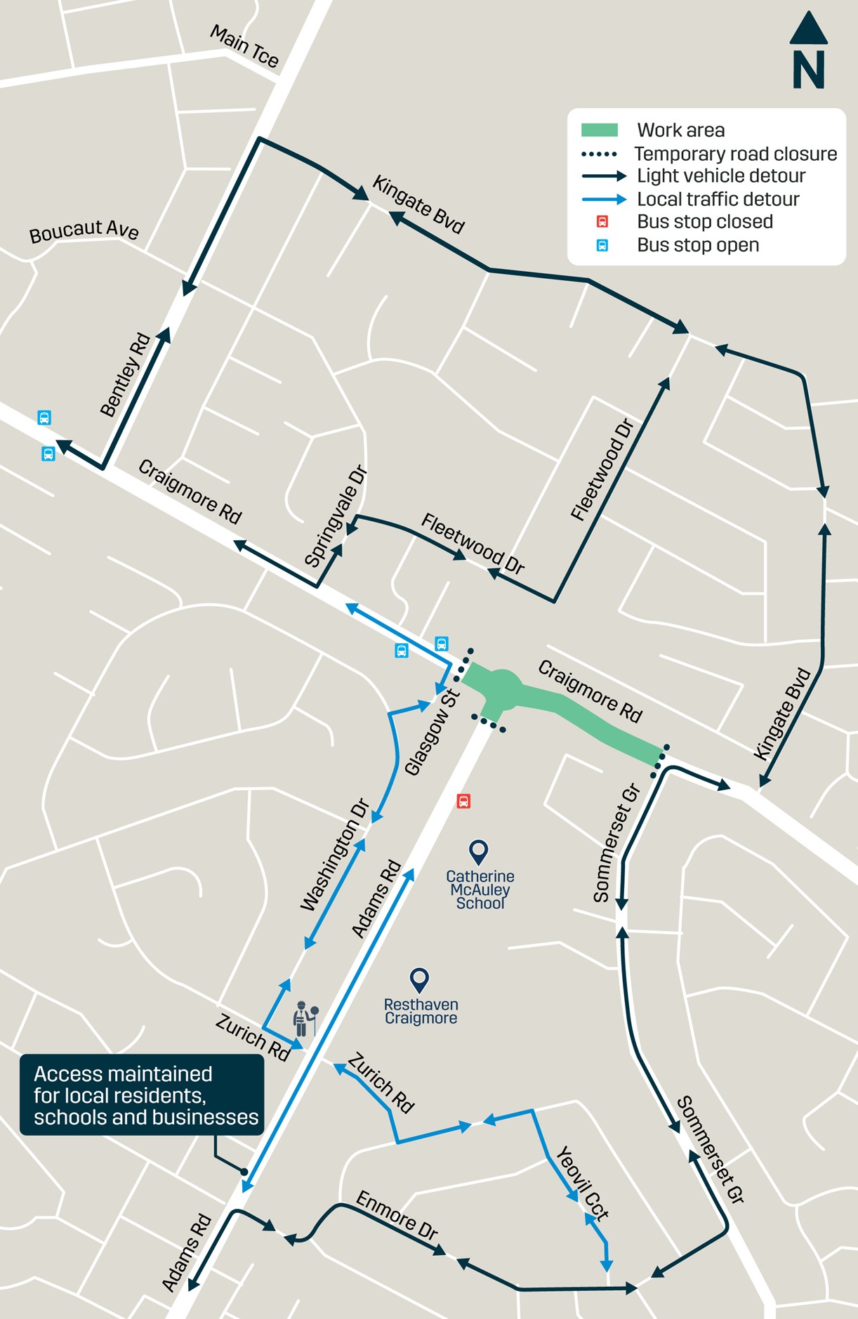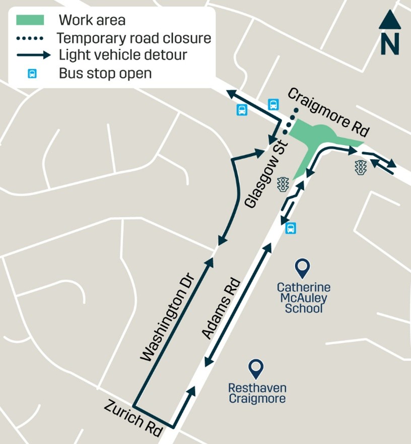 - Craigmore Road and Adams Road roundabout will have restricted access restricted from 27 April to 1 May 2026. Access maintained via the south-east corner only