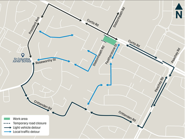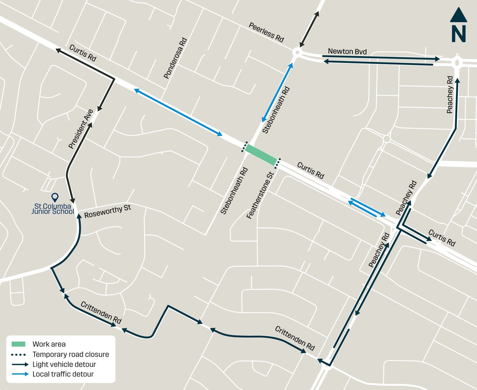 - Stebonheath Road will be closed, across both lanes, south of the Curtis Road roundabout to traffic during the day Monday to Friday, from approximately Monday 3 November until Friday 7 November 2025