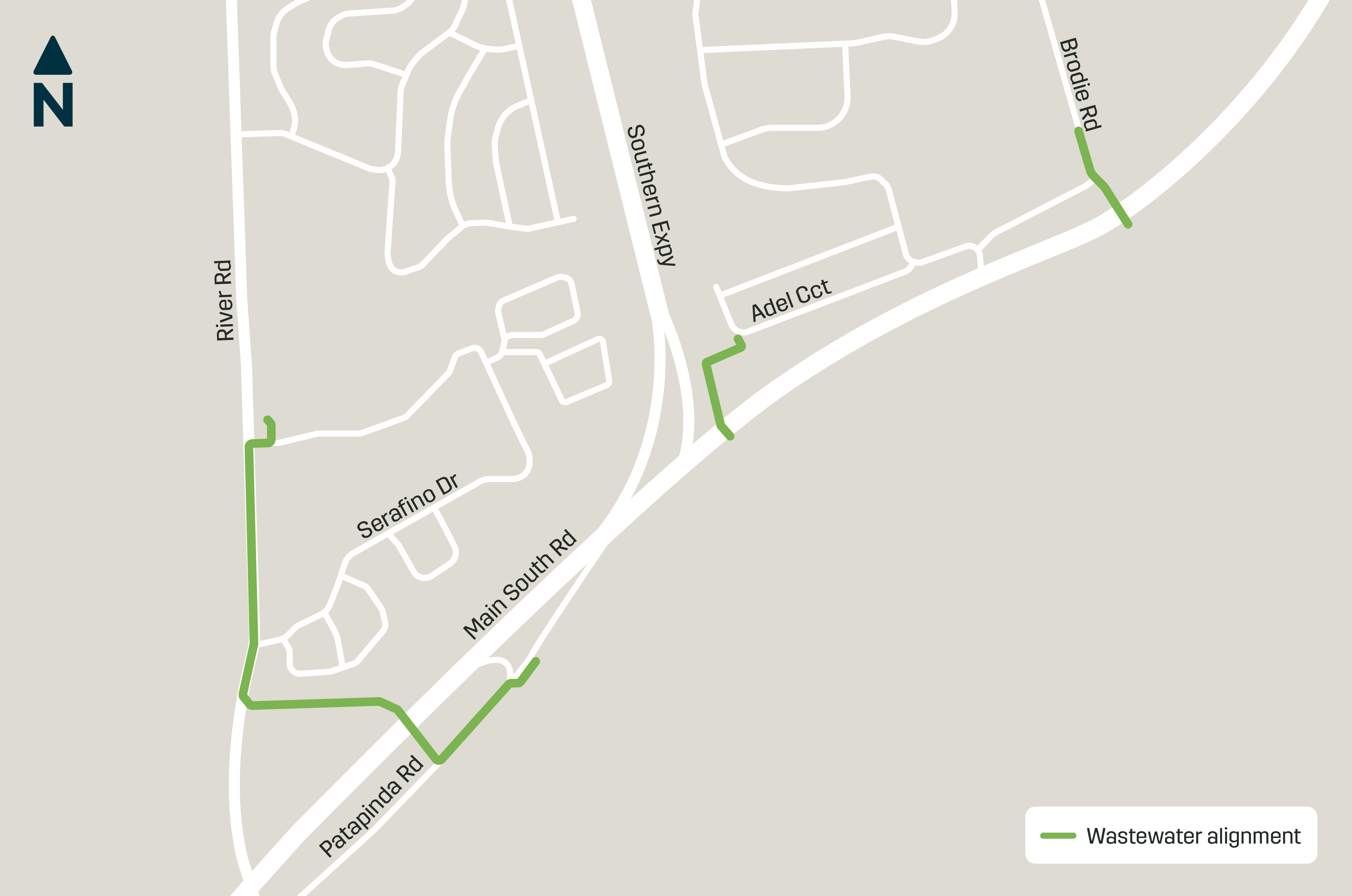 In May 2025, installation will begin on a new gravity‑fed wastewater main. The alignment includes three sections, each crossing Main South Road via micro‑tunnelling.
